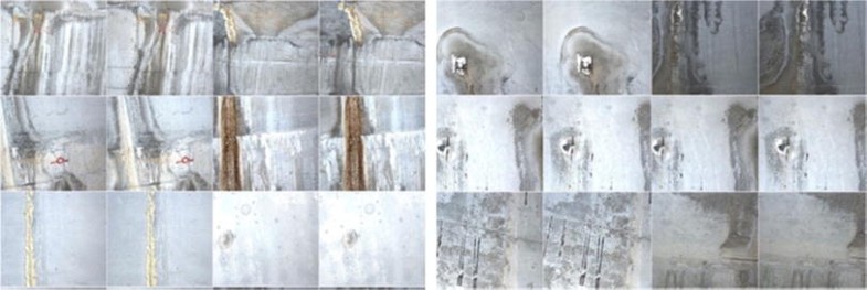 The training process requires a balanced data set, i.e., the ratio between cracked and the non-cracked regions is set 1–3. Ideally, given an annotated image of size 3376 × 2704, less than 0.05% corresponds to the cracked areas; i.e., we have at most 4500 positive training paradigms (image patches of size 13 × 13) per image. In order to further extend the positive paradigms training set, we involve patch rotations at 30° and 60°.