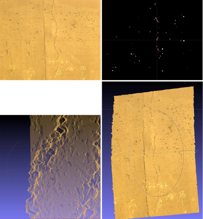 An example of the reconstruction model derived around a detected crack. The first row depicts the region of the crack. In particular, the left image shows the original image captured by the vision module of the ROBO-SPECT robotic system. The right image depicts the detected crack regions by the computer vision interface. The second row of images depict the 3D reconstruction model created around the crack area. In particular, the right image presents the 3D model created, while the left image a zoom of the model to show 3D modelling precision accuracy