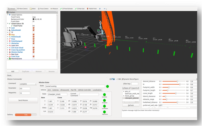 The vehicle navigation control is based on the 3D simultaneous localization and mapping (SLAM) algorithm. Using the on-board navigation sensors and installed landmarks (beacons) in the tunnels, the navigation will focus on tracking the tunnel wall at a defined distance, commonly between 1.5 and 3 m. The location of the landmarks will be in the range of 15 m between them, being commonly 3–4 marks visible from the vehicle at any moment.