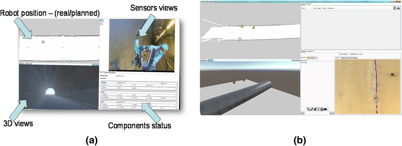 Snapshots of the ground control station user interface, which display the remote planning and control interface of the mission. a Image the robot position is monitored on the top view map of the tunnel and on a virtual reality environment; the real conditions of the tunnel are monitored via an IP camera; the detected anomalies are recorded and displayed on the lower right part of the snapshot. b The human inspector can intervene with the inspection process and annotate an image of the tunnel lining, either for correcting a misclassified defect, either for keeping his own remark of the inspection