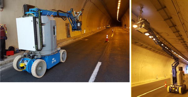 The ROBO-SPECT robotic platform consists of an industrial wheeled robotic vehicle and an automated crane. The system is automated through the use of robotic controllers. The vehicle chosen is the Genie Z30/20N,1 along with an articulated crane that can inspect tunnels up to 7 m size, to be able to touch any sector of the tunnel. The robotic vehicle is currently adjusted to move on road conditions. The platform is able to move autonomously in the tunnel, exploiting collision avoidance procedures based on laser sensors that are placed on the vehicle and the arm.