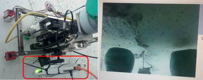 As we have mentioned in Sect. 3.1.2, landmarks are used in the tunnel to assist robot navigation as well as to geo-reference the robotic system. This way, the coordinates of the detected crack are projected to the global coordinates of the tunnel. 3D SLAM methods are exploited to navigate the robotic arm towards the crack. Each time a crack is detected, the controller moves the robotic arm towards the direction of the crack to approximate it. Then, new images are shot and a new crack detection is activated to refine the position of the crack with respect to the local coordinate system of the cameras, forcing the controller to move the robotic arm closer to the crack.