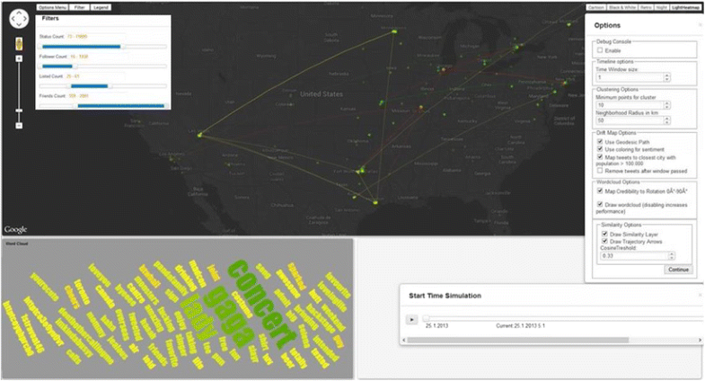 Concerning the representation of the dynamic aspects, to obtain a view of the changes in terms/topics over time, a local database (such as (MongoDB 2009)) plus a query system represents a common solution (which can be found, e.g., in (Hassan et al. 2014; Kraft et al. 2013)). Thus, it is possible to navigate in the past using different interactions; a time slider is adopted, e.g., by ((Bosch et al. 2013; Chae et al. 2012; Musleh 2014; Morstatter et al. 2013; Liu et al. 2011), whereas animation can be found in (Cao et al. 2012; Abel et al. 2012a, b; Musleh 2014). Finally, in a few cases, a geographical search (independent of the bounding box defined in the APIs) is also occasionally possible; it can be pre-defined (e.g. Ireland (Pozdnoukhov and Kaiser 2011), US (Meyer et al. 2011)) or user defined (Bosch et al. 2013; Chae et al. 2012).