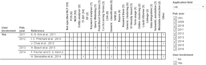 The second chart illustrates the analytical methods and user involvement,8 as discussed in “Analytical Methods” section. In particular, Fig. 8 shows the few exceptions among the surveyed papers that involve the user in the analytical part of the process. Similar to the previous case, a researcher or a student can further explore the papers using the provided filters.