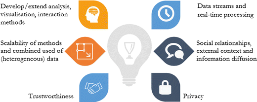 Changing the spatial focus can have implications for the analysed language. Although some of the analysis methods might be easily transferable between languages, such a transfer becomes difficult as more grammar is considered, for example, with the identification of negation or amplifications (Hauthal and Burghardt 2014). Thus, there is much potential for the usage of in-depth language processing (Wanner et al. 2014), e.g., disambiguation, polarity extraction and named entity recognition. In fact, scalability related to the thematic dimension requires the selection of multiple groups of keywords, processing of datasets with large numbers of entities, or a high degree of detail represented by attributes or relationships. The temporal dimension of scalability becomes important when datasets with very long histories or those with varying granularity from years to seconds are analysed. High update rates require methods of real-time processing, as mentioned in the section on data streams. Challenging research on the temporal information relates also to the evolution of events, topics or topic categories to discover that, e.g., some topics show repetitive behaviour on certain hours or days or reoccur during the weekend rather than on weekdays.