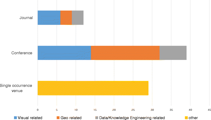 Number of papers based on typology (journal or conference) and category. The yellow bar summarizes venues with a single paper and that are not included in the other three main publication categories (visual, geo, or data/knowledge engineering-related).