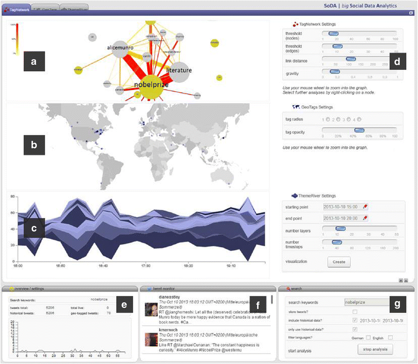 SoDa (Hassan et al. 2014) incorporates content, location and temporal aspects in a composite interface. In detail, the weighted tag network (A) shows the semantic relationships between related hashtags; the GeoTag Map (B) illustrates the geographic distribution of the tweets; the adjustable ThemeRiver (C) depicts the temporal evolution of topics; the right panel (D) offers plenty of interaction and manipulation options; the left sub-window (E) supplies general statistics; the tweet monitor (F) displays a list of currently incoming tweets; finally, the third sub-window (G) allows the search for keywords or the application of language filters