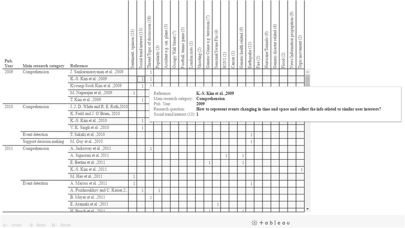 Finally, the last two charts encompass the visual methods that focus on spatial and temporal aspects9 and the visual methods that focus on the microblogging content analysis,10 respectively (Visual Methods section). As in the previous cases, filters related to visual methods and publication year support a more detailed exploration based on different user needs.