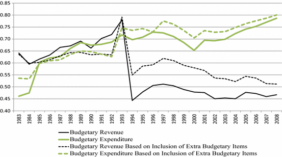 We initially calculated the shares of central and local government’s fiscal expenditure and revenue for the period 1982–2008 from the Finance Yearbook of China 2012. Defining these fiscal shares requires careful handling of extra budgetary revenues and expenditures. Tsui (2005) and Tochkov (2007) pointed out the reverse effects of central government budgetary transfers and extra budgetary funds on local governments’ expenditures. In the next section, we estimate models based on including and excluding extra budgetary items from the shares.