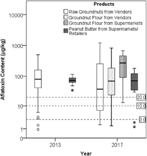 This study was performed as a follow-up to a study from 2013, to assess the impact of management interventions on aflatoxin incidence and levels in commercial groundnut products in Malawi. Sixty-seven samples of commercial groundnut products were analyzed for aflatoxin using a fluorometric method. Total aflatoxin levels ranged from 1.5 to 1200 μg/kg in raw groundnuts and 83–820 μg/kg in groundnut flour from vendors. In branded groundnut flour and peanut butter from supermarkets, aflatoxin levels ranged from 13 to 670 μg/kg and 1.3 to 180 μg/kg, respectively. About 93, 88, 78 and 72% of the samples analyzed contained aflatoxin levels above regulatory limit used in Malawi (3 μg/kg), EU (4 μg/kg), most developing countries (10 μg/kg), and the USA (20 μg/kg), respectively. Despite much effort, aflatoxin levels remain persistently high in commercial groundnut. Considering the difficulty of achieving an efficient government regulation system due to resource constraint, the authors recommend the promotion of a socially responsible groundnut processing industry that has consumer welfare as its central feature.