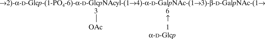 Methylation analysis of the OPS by GLC-MS showed the presence of terminal glucose, 2-substituted glucose, and 3-substituted and 4,6-disubstituted galactosamine residues (Table 2). After dephosphorylation of the OPS followed by methylation analysis including acetylation, the major derivative of terminal glucosamine (3,4,6-Me3GlcNAc) was also identified together with a trace amount of an N-(3-hydroxybutyryl) derivative (3,4,6-Me3GlcNAcyl). Therefore, the glucosamine derivative in the OPS is phosphorylated and, at least partially, N-acylated with the 3-hydroxybutyryl group. The content of 3-hydroxybutyric acid in the OPS (0.8 µM/mg) was determined by an enzymatic method after hydrolysis of the OPS with 4 M HC1 (100°C for 2.5 h). In addition, the OPS was also found to contain O-acetyl groups (0.38 µM/mg) and, hence, is non-stoichiometrically O-acetylated.