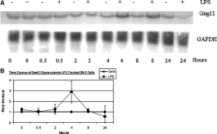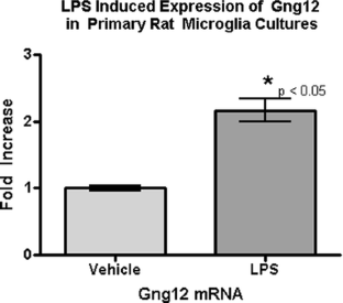 A set of 77 genes that were modulated only in microglial cells after LPS stimulation was identified. One gene of interest, Gng12, was investigated further to determine its ability to modify the inflammatory response. Specifically, Gng12 mRNA levels were transiently increased after LPS stimulation. In addition, overall levels of Gng12 mRNA after LPS stimulation were significantly higher in BV-2 cells as compared to macrophage cells.