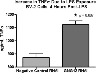 Modulating Gng12 mRNA levels using RNAi revealed a novel role for the factor in the negative regulation of the overall inflammatory response as based on effects on nitrite and TNFα levels. These data suggest that Gng12 is a negative regulator of the LPS response and may be an important factor in the overall inflammatory signaling cascade.