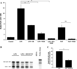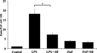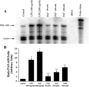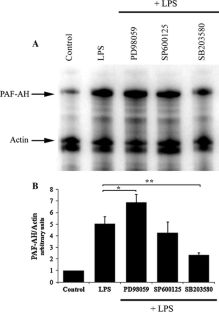Ribonuclease protection assays and quantitative real-time PCR were used to investigate the ability of lipopolysaccharide (LPS) and PAF to regulate PAF-AH mRNA expression in human monocyte–macrophage 6 (MM6) cells. Pharmacological inhibitors of mitogen activated protein kinases (MAPK) and PAF receptor antagonists were used to investigate the mechanism of regulation of PAF-AH.