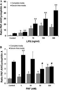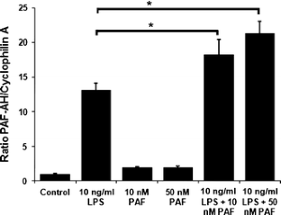 PAF-AH mRNA levels were increased upon exposure to LPS or PAF in a dose-dependent manner. LPS elicited a more potent and rapid increase in PAF-AH expression than the PAF-stimulated response. However, when administered concomitantly, PAF augmented the LPS-stimulated response. LPS-stimulated PAF-AH expression was susceptible to partial inhibition by a p38 MAPK inhibitor and PAF receptor antagonists. PAF-induced up-regulation of PAF-AH levels was solely mediated via the PAF receptor and was p38 MAPK-independent.