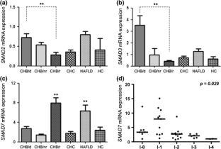 TGF-β signalling is activated in CHB patients with active disease, while SMAD7 is up-regulated during the resolution of inflammation after successful treatment. SMAD7 overexpression was also observed in NAFLD patients exhibiting no or minimal fibrosis, despite the activation of TGF-β/activin signaling.