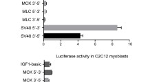 Satellite cells are muscle precursor cells located between the basement and sarcolemmal membrane in skeletal muscles [1]. These mononuclear cells are activated in response to injury or recovery from atrophy, which is required for efficient regeneration and restoration of muscle mass [2, 3]. Proliferating satellite cells are referred to as myoblasts, which subsequently differentiate to fuse with existing myofibers or form new myofibers [4]. In addition to myoblast fusion, myogenic differentiation is characterized by increased transcriptional activity of the muscle regulatory factors (MRFs), which promote expression of muscle-specific genes. Examples of muscle-specific genes are structural proteins of the contractile apparatus such as troponin-I (TnI) and myosin heavy chain (MyHC), and enzymes involved in muscle energy metabolism such as muscle creatine kinase (MCK) [5].