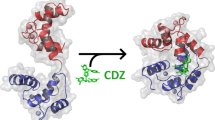 The CaM-dependent serine/threonine phosphatase calcineurin (also denoted protein phosphatase 2B) is representative of heterodimeric proteins with a CBS and CLBS located in distinct subunits (Fig. 3d). Melittin interacts with calcineurin, indicative that this CaM-binding peptide binds to CLBS that interacts with the CBS as described above and in Fig. 3d [20]. This phosphatase regulates multiple cellular functions, best studied is the dephosphorylation of the transcription factor NFAT inducing its nuclear translocation to initiate its transcriptional program (reviewed in [134]). This enzyme is also target of immunosuppressive drugs used in the clinic, such as cyclosporin A and FK506 (tacrolimus) (reviewed in [135, 136]). Calcineurin is formed by a 60 kDa catalytic subunit (CaN-A) that binds calmodulin, and a 19 kDa regulatory subunit denoted CaN-B with four EF-hands Ca2+-binding sites (see Figs. 1, 3d). CaN-B is myristoylated at its N-terminus (reviewed in [137]) and has structural similarity to CaM [138]. At low Ca2+ concentration the binding of Ca2+ to the two high-affinity sites of CaN-B maintains the CBS of CaN-A bound to a CLBS located in the same subunit, allowing auto-inhibition. At high Ca2+ concentration the low-affinity Ca2+ binding sites at CaN-B are also occupied and the CBS dissociates from this site. Thereafter, Ca2+/CaM binds to the CBS in CaN-A displacing an auto-inhibitory domain located at the C-terminus of its catalytic site yielding the fully active enzyme (reviewed in [135, 136, 139]). Apparently, a disordered fragment of the auto-inhibitory domain blocks access to the catalytic site playing a central role in the auto-inhibition mechanism [140]. Recent structural studies on the interaction of CaM with a peptide corresponding to CaN-A further refined this model for the activation of calcineurin by Ca2+/CaM and its regulatory subunit [141]. However, the CaN-Aβ1 isoform shows a distinct non-canonical regulation by Ca2+ and CaM, as it lacks an auto-inhibitory domain but a four amino acid motif (462LAVP465) competitively inhibits the enzyme conferring basal and Ca2+-dependent activity decreasing its need of CaM [142]. Using luminescent lanthanides, as surrogate cations for Ca2+, it was demonstrated that the highest affinity for Tb3+ is located in the C-terminal region of CaN-B [143]. Using 113Cd NMR and Ca2+ flow-dialysis the existence of a single EF-hand with high affinity for Ca2+ (close to 10 nM) and three others of lower affinity (close to 10 µM) were identified [144]. Mutational inactivation of CaN-B impairing Ca2+-binding to EF-hands 1, 2 and 3, but not EF-hand 4, has shown that these sites are required for the catalytic activity of CaN-A in the absence of CaM, with an essential role of EF-hand 2. Moreover, eliminating the Ca2+-binding capacity of EF-hand 2 on CaN-B decreases the affinity of CaM for CaN-A at low Ca2+ concentration [145].