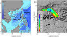 The best fit scenario is used for an inundation study for the two selected regions at the Java coast described above (see Fig. 4). As stated above, the topographic data used to create the grid for the inundation analysis are based on open source information. As reported elsewhere (Griffin et al. 2015), such data can often lead to hindering the onshore flow and hence limit the horizontal inundation. Hence, we do not show inundation distances. Moreover, we remark that our ability to model local inundation effects are more limited than if high resolution data were available.