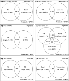 Lake nutrient budgets and hydrology are being altered by human activities and climate change, yet little is known of how fertilization and hydrologic mechanisms interact to structure assemblages of primary producers. Here, we present sediment records from a large shallow lake in Southwest China to separate the relative importance of nutrients and hydrological fluctuation in regulating the abundance and composition of primary producers during the twentieth century, with a focus on their differential effects on diatoms and cyanobacteria. Shifts in sedimentary particle-size distribution were consistent with the documented events of hydrological regulation during ~ 1953–1971 and subsequent changes in water level associated with severe droughts. Nutrient enrichment since ~ 1965 resulted in a significant increase in the abundance of total phototrophs (pheophytin a, β-carotene) as inferred from pigment analyses, with stronger responses of cyanobacteria (echinenone, zeaxanthin) over siliceous algae (diatoxanthin). Fossil diatom assemblages revealed a pronounced replacement of benthic taxa by eutrophic and planktonic species (e.g., Fragilaria crotonensis) since ~ 1973, but we observed a significant increase of small benthic Fragilaria sensu lato taxa following ~ 2005, which generally corresponded with a moderate increase in fossil pigments. Although eutrophication was the paramount predictor of changes in phototrophs during the last century, variation in lake hydrology due to climate and water management also modulated phototroph abundances and, more recently, diatom assemblages. Specifically, our sediment evidence suggests that hydrological fluctuation has overridden fertilization by nutrients in structuring diatom composition, leading to a heterogeneous response of cyanobacteria and diatoms to external forcing of this shallow lake.