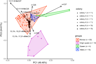 Bonckaert W, Drijfhout FP, d’Ettorre P et al (2012) Hydrocarbon signatures of egg maternity, caste membership and reproductive status in the common wasp. J Chem Ecol 38:42–51. https://doi.org/10.1007/s10886-011-0055-9