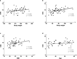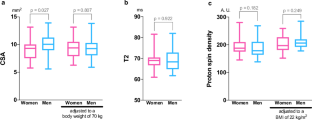 The average nerve CSA correlated moderately with height (r = 0.28, p = 0.04), weight (r = 0.40, p = 0.002), and BMI (r = 0.35, p = 0.008), but not with age (r = 0.23, p = 0.09). While T2 did not correlate with demographic parameters, PSD was strongly inversely associated with BMI (r = −0.64, p < 0.001) and weight (r = −0.557, p < 0.001). Sex-dependent differences in imaging marker values were found for CSA but became negligible after normalization to body weight.