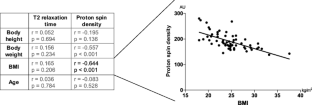 In this study 60 healthy individuals (5 men and 5 women of every decade between 20 and 80 years) were examined according to a standardized MRN protocol at 3 T, including multiecho T2 relaxometry. Nerve cross-sectional area (CSA), transverse relaxation time (T2), and proton spin density (PSD) were assessed for the sciatic, tibial, median, ulnar, and radial nerves. Correlation with demographic variables, such as height, weight, body mass index (BMI), and age was expressed by Pearson coefficients and t‑tests were used to compare MRN biomarkers between men and women with and without normalization to body weight and BMI by linear regression.