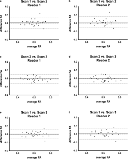 The mean ± standard deviation was 0.507 ± 0.05 for FA, 1308.5 ± 162.4 × 10−6 mm2/s for MD, 905.6 ± 145.4 ×10−6 mm2/s for RD and 2114.1 ± 219.2 × 10−6 mm2/s for AD. The SEM for FA was 0.02 for interreader and test-retest agreement, the SEM for MD, RD, and AD ranged between 46.2 × 10−6 mm2/s (RD) and 70.1 × 10−6 mm2/s (AD) for interreader reliability and between 45.9 × 10−6 mm2/s (RD) and 70.1 × 10−6 mm2/s (AD) for test-retest reliability. The ICC for interreader reliability of DTI parameters ranged between 0.81 and 0.92 and ICC for test-retest reliability between 0.76 and 0.91.