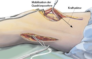 Die am Fibulakopf inserierende Sehne des M. biceps femoris wird unter sorgfältiger Schonung des unmittelbar dahinter gelegenen N. peronaeus communis am knöchernen Ansatz scharf abgetrennt und nach proximal soweit mobilisiert, dass später eine nach ventral gerichtete Verlaufsrichtung eine optimale Kraftentfaltung bewirkt. Dabei sind die segmental eintretenden neurovaskulären Bündel zu schonen. Über den am Oberschenkel vorhandenen oder zu schaffenden ventralen Zugang wird anschließend das Septum intermusculare laterale ausreichend weit eröffnet und der Sehnenstumpf nach ventral durchgezogen. Hier wird die Sehne in den Periostfaszienanteil der Patella eingeflochten und stabil vernäht.