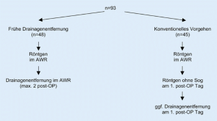 Dreiundneunzig Patienten erfüllten die Einschlusskriterien (VATS-Operationen, u. a. atypische Lungenresektion, ausgedehnte Lunge im postoperativen Röntgenbild) und wiesen keine Ausschlusskriterien auf (Lungenvolumenreduktion, narbige Lungenfibrose, Pneumothorax, Pleuraerguss, Luftfistel). Die Randomisierung führte bei 48 Patienten zur frühen Thoraxdrainagenentfernung nach 90–120 min. Bei 45 Patienten wurde die Drainage belassen und im Median am 2. postoperativen Tag entfernt.