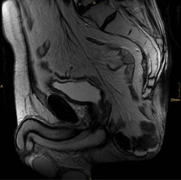 A 66-year-old man presented with a painful perineal tumor 2 years after abdominoperineal excision for rectal adenocarcinoma. Perineal hernia was confirmed by magnetic resonance imaging, and the patient underwent open mesh repair through a perineal approach.