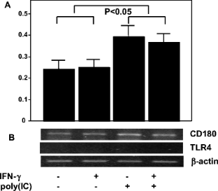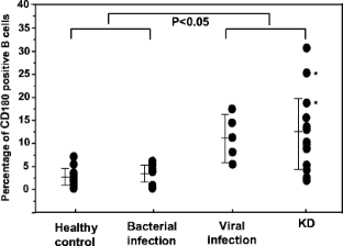 Kawasaki disease (KD) is an acute febrile illness in childhood characterized by the formation of aneurysms in coronary arteries. It is believed that KD is caused by infectious agents because of its epidemic waves and high incidence of familial occurrence. Because an increase in the levels and dysfunction of B cells in peripheral blood was reported in KD, we investigated the expression of cluster of differentiation 180 (CD180), a toll-like receptor homologue, in the B cells of children with KD, and in those with bacterial or viral infections. The percentages of CD180 positive B cells were significantly higher in children with KD or viral infections than in those with bacterial infections or in healthy controls. When the expression levels of CD180 were compared by using the mean fluorescent intensity ratio of patients to healthy controls, the level of CD180 expression was also significantly up-regulated in children with KD or viral infections. To clarify the effect of viral infection on the expression of CD180, B cells were stimulated with poly inosinic-cytidyric acid [poly(IC)], a synthetic double-stranded RNA. Poly(IC) clearly enhanced CD180 expression in B cells in vitro, both at the protein and messenger RNA levels. These results suggest that similar mechanisms may be involved in the up-regulation of B cell CD180 expression in patients with either KD or viral infections.