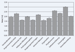 In total 304 medical students undertaking the OSCE were included in the study. The students were asked to fill out a standardized questionnaire which contained different evaluation parameters, such as test adequacy, comprehensibility, balance, difficulty, atmosphere and clinical relevance as well as self-assessment and overall rating.