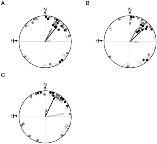 Previous experiments on wild rock doves (Columba l. livia Gmelin) released within their familiar area revealed an evident effect of fast-shifting, although shifted doves, but not controls, tended to orient homeward. Such an outcome suggested a possible influence of the release time per se on the directional choices of the tested doves. In the present study, this hypothesis was investigated by comparing the orientation of slow-shifted birds to that of two control groups released at different times of the day. As would be expected if doves make use of a time-compensated sun compass, the bearings of shifted birds were deflected clockwise with respect to controls. The time of release itself seemed to influence only the scatter of the vanishing bearings of controls. These findings testify to the substantial similarity of clock-shift effects on the initial orientation of rock doves to those on homing pigeons released from familiar sites.