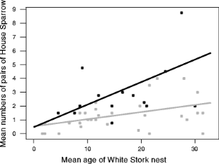 As with many farmland bird species, the house sparrow Passer domesticus is declining in Europe, mainly due to intensification of agriculture reducing nest sites and food supplies. During 2002–2005, we studied the population size and nest site characteristics of house sparrows breeding within white stork Ciconia ciconia nests in a large area of agricultural landscape within western Poland. To explain sparrow density within stork nests, we examined characteristics of white stork nests (position, age, productivity) and the farm type around the nest. House sparrow density was greatest in the longest established (and hence larger) white stork nests located on traditionally managed farms. Two recent changes appear to have adverse effects on house sparrows. The first is the intensification of farming and the second is active management of white stork nests on electric poles to reduce nest size and thus avoid both disruption to the electrical supply and electrocution of white storks. Because the white stork has such a high profile in Poland, there are numerous schemes to conserve and enhance this species. In conclusion, we clearly show that protecting one species can have valuable, although unplanned, benefits to another species of conservation interest, the house sparrow.