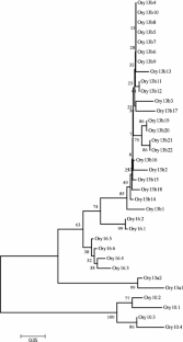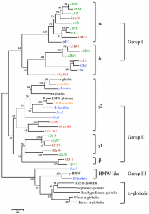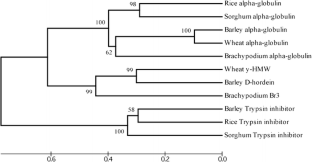 Amino acid sequence alignment of all prolamins from rice, sorghum, maize, wheat, barley, rye, Brachypodium with MAFFT program (Katoh and Toh 2008) with manually modified, repetitive domains of all prolamins are deleted, and S-poor prolamins (omega-gliadin, omega-secalin and B-hordein) are removed for analysis because of their most totally repetitive DNA. See Fig. 4 for details (PDF 169 kb)