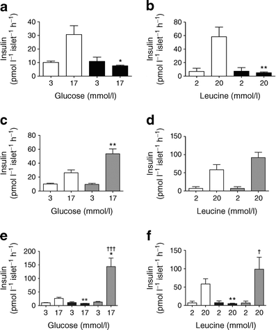 For islet insulin secretion assays, batches of eight size-matched islets were pre-incubated for 1 h at 37°C in HBSS containing 3 mmol/l glucose, 10 mmol/l HEPES (pH 7.4) and 0.2% BSA (wt/vol.). For GSIS, islets were incubated for 1 h at 37°C in HBSS (10 mmol/l HEPES [pH 7.4], 0.2% BSA) supplemented with 3 or 17 mmol/l glucose. For leucine-stimulated insulin secretion (LSIS), islets were incubated for 1 h at 37°C in HBSS (3 mmol/l glucose, 10 mmol/l HEPES [pH 7.4], 0.2% BSA) supplemented with 2 or 20 mmol/l leucine. After 1 h, media were collected for determination of insulin levels.