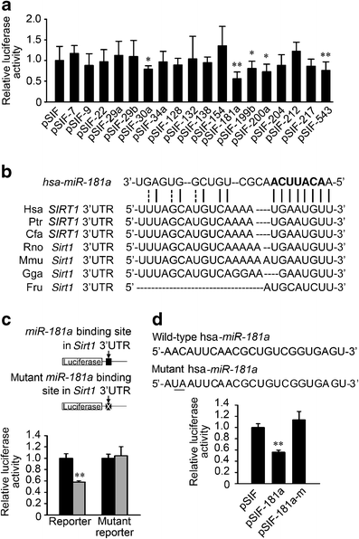 MiR-181a targets Sirt11 3′UTR. a Among the 18 predicted miRNAs, miR-181a showed the most significant repressive effect on the activity of Sirt1 3′UTR. After transfection with pRL-Sirt1-3′UTR and the indicated plasmids for 72 h, HEK293T cells were harvested for luciferase assay. *p < 0.05, **p < 0.01 vs pSIF-GFP (pSIF). b Sequence alignment of human (Hsa) miR-181a with the 3′UTRs of chimpanzee (Ptr), dog (Cfa), rat (Rno), mouse (Mmu), chicken (Gga) and pufferfish (Fru) Sirt1. The seed region of miR-181a is indicated in bold. c Mutation of the predicted miR-181a binding site in Sirt1 3′UTR abrogated the repressive effect of miR-181a on the activity of Sirt1 3′UTR when measured by luciferase assay. Black bars, pSIF; grey bars, pSIF-181a. **p < 0.01 vs pSIF or mutant reporter. d Mutation of the miR-181a seed region abrogated the repressive effect of miR-181a on the activity of Sirt1 3′UTR. **p < 0.01 vs pSIF or pSIF-181a-m. Error bars represent SD
