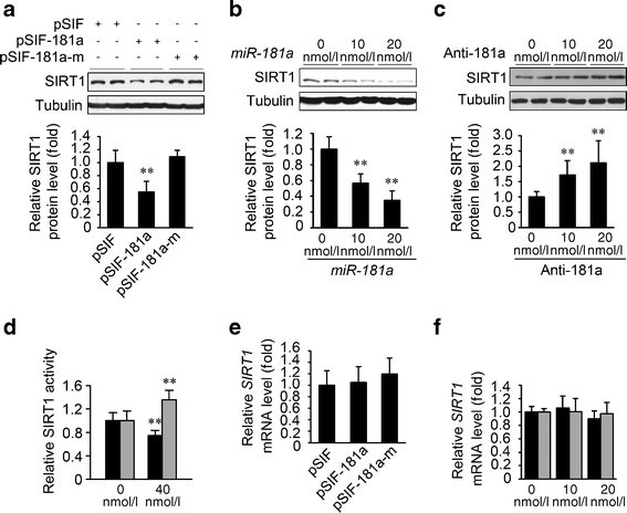 miR-181a downregulates SIRT1 protein abundance at the translational level. a Overexpression of miR-181a but not mutant miR-181a decreased SIRT1 protein levels. After transfection with the indicated plasmids for 72 h, HEK293T cells were harvested for immunoblotting. **p < 0.01 vs pSIF-GFP (pSIF) or pSIF-181a-m expressing mutant miR-181a. b Overexpression of miR-181a dose-dependently downregulated SIRT1 protein levels. After transfection with miR-181a mimics at the indicated concentrations for 72 h, HEK293T cells were harvested for immunoblotting. The doses in nmol/l represent irrelevant miRNA mimics for cel-miR-239b or anti-cel-miR-239b co-transfected as a mock control to equalise the total amount of miRNA mimics or anti-sense oligonucleotides for each transfection; 0 nmol/l represents cells transfected with only cel-miR-239b mimics or anti-cel-miR-239b. **p < 0.01 vs cells treated with only a mock transfection. c Inhibition of miR-181a by antisense oligonucleotides dose-dependently increased SIRT1 protein levels. After transfection with anti-181a at the indicated concentrations for 72 h, HEK293T cells were harvested for immunoblotting. **p < 0.01 vs cells treated with only a mock transfection. d Overexpression of miR-181a decreased SIRT1 activity, whereas inhibition of miR-181a increased SIRT1 activity. After transfection with the indicated oligonucleotides for 72 h, the nuclear protein of HepG2 cells were extracted to measure SIRT1 activity. Black bars, miR-181a; grey bars, anti-181a. **p < 0.01 vs cells treated with only a mock transfection. e Overexpression of miR-181a had no effect on SIRT1 mRNA levels. After transfection with the indicated plasmids for 72 h, HEK293T cells were harvested for real-time PCR. f Overexpression or inhibition of miR-181a had no effect on SIRT1 mRNA levels. After transfection with the indicated oligonucleotides for 72 h, HEK293T cells were harvested for real-time PCR. Black bars, miR-181a; grey bars, anti-181a. Error bars represent SD