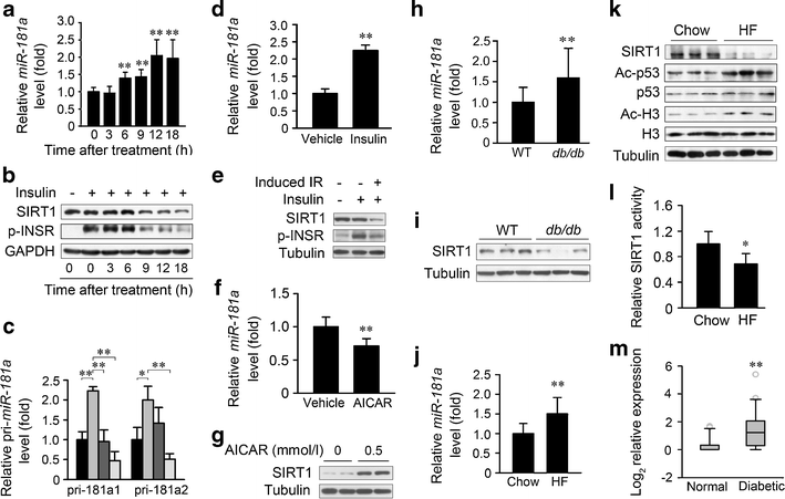 MiR-181a is increased under insulin-resistant conditions and negatively correlated with SIRT1. a Glucosamine upregulated miR-181a level in a time-dependent manner in HepG2 cells. After treatment with glucosamine for the indicated time, HepG2 cells were harvested for real-time PCR. **p < 0.01 vs no treatment. b Glucosamine decreased SIRT1 protein level and induced insulin resistance in HepG2 cells in a time-dependent manner. After treatment with glucosamine for the indicated time, HepG2 cells were stimulated with or without 100 nmol/l insulin for 15 min, and then harvested for immunoblotting. c Glucosamine upregulated the levels of primary miR-181a (pri-181a), and this was significantly attenuated by transcription inhibitor actinomycin D (AMD). HepG2 cells were treated with glucosamine for 18 h to induce insulin resistance (IR) and harvested for real-time PCR. 0.5 mg/ml AMD was added 1 or 3 h before harvesting the cells. Black bars, control; mid-grey bars, glucosamine; dark grey bars, glucosamine + AMD 1 h; light grey bars, glucosamine + AMD 3 h. *p < 0.05, **p < 0.01. d, e Insulin-induced insulin resistance and its correlation with miR-181a and SIRT1 in HepG2 cells. HepG2 cells were treated with 100 nmol/l insulin for 24 h and stimulated with or without insulin for 15 min, before being harvested for real-time PCR or immunoblotting. f, g AICAR significantly elevated SIRT1 protein levels and decreased miR-181a level in HepG2 cells. HepG2 cells were treated with 0.5 mmol/l AICAR for 48 h, and then harvested for real-time PCR or immunoblotting. **p < 0.01. h, i MiR-181a was increased while SIRT1 protein levels were decreased in the liver of db/db mice compared with their littermates. The liver samples from 10-week-old mice with the indicated genotypes were analysed by real-time PCR and immunoblotting. **p < 0.01, n = 14 for each genotype. j, k, l MiR-181a was increased while SIRT1 protein levels and activity were decreased in the livers of DIO mice. Tissues were collected from 16-week-old mice fed chow or a high-fat diet for 10 weeks. **p < 0.01, *p < 0.05, n = 9 for each group. m miR-181a was increased in the serum of diabetic patients. miR-181a levels were detected by real-time PCR, and the relative quantification data were analysed on the log (base 2) scale. **p < 0.01, n = 20 for each group. Error bars represent SD