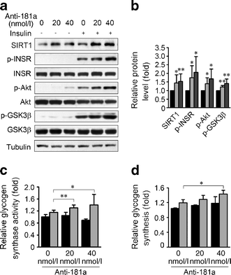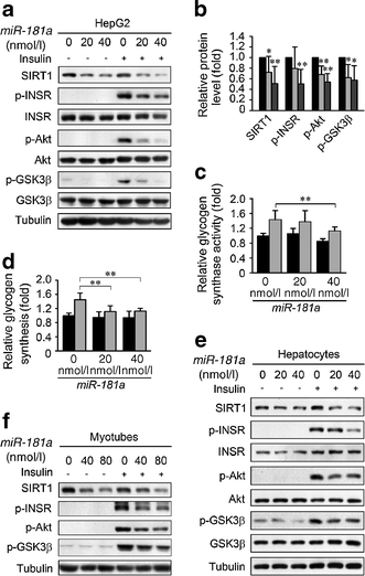 Overexpression of miR-181a downregulates SIRT1 protein levels and induces insulin resistance. a Overexpression of miR-181a decreased SIRT1 protein levels and the insulin-stimulated phosphorylation of INSR, Akt, and GSK3β in HepG2 cells. After transfection with miR-181a mimics at the indicated concentrations for 72 h, HepG2 cells were stimulated with 100 nmol/l insulin for 15 min and subsequently harvested for immunoblotting. b Quantification of SIRT1 protein levels and insulin-stimulated phosphorylation levels of INSR, Akt and GSK3β corresponding to (a). Black bars, 0 nmol/l; light grey bars, 20 nmol/l; dark grey bars, 40 nmol/l. *p < 0.05, **p < 0.01 vs cells treated with only a mock transfection. c, d Overexpression of miR-181a decreased insulin-stimulated upregulation of glycogen synthase activity (c) and glycogen synthesis (d) in HepG2 cells. Black bars, control; grey bars, insulin. **p < 0.01 vs insulin-stimulated cells treated with only a mock transfection. e, f Overexpression of miR-181a decreased SIRT1 protein levels and the insulin-stimulated phosphorylation of INSR, Akt and GSK3β in primary cultured hepatocytes (e) and C2C12 myotubes (f), respectively. Protein levels were analysed by immunoblotting. Error bars represent SD