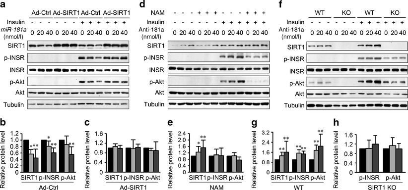 Regulation of insulin signalling by miR-181a is significantly dependent on SIRT1. a Ectopic expression of SIRT1 by adenovirus (Ad-SIRT1) abrogated the negative effect of miR-181a on the insulin-stimulated phosphorylation of INSR and Akt in HepG2 cells. Ad-Ctrl, control adenovirus. Protein levels were analysed by immunoblotting. b, c Quantification of SIRT1 protein levels and the insulin-stimulated phosphorylation levels of INSR and Akt in HepG2 cells infected with Ad-Ctrl (b) or Ad-SIRT1 (c) in (a). Black bars, 0 nmol/l; light grey bars, 20 nmol/l; dark grey bars, 40 nmol/l. *p < 0.05, **p < 0.01 vs cells in the same group treated with only a mock transfection. d Inhibition of SIRT1 activity by nicotinamide (NAM) abrogated the positive effect of anti-181a on insulin-stimulated phosphorylation of INSR and Akt in HepG2 cells under glucosamine-induced insulin-resistant conditions. Protein levels were analysed by immunoblotting. e Quantification of SIRT1 protein levels and the insulin-stimulated phosphorylation levels of INSR and Akt in HepG2 cells treated with NAM in (d). Black bars, 0 nmol/l; light grey bars, 20 nmol/l; dark grey bars, 40 nmol/l. *p < 0.05, **p < 0.01 vs cells in the same group treated only with a mock transfection. f The improvement in insulin signalling by antisense miR-181a was markedly abrogated in primary hepatocytes of Sirt1 knockout (KO) mice under glucosamine-induced insulin-resistant conditions. g, h Quantification of SIRT1 protein levels and the insulin-stimulated phosphorylation levels of INSR and Akt in primary hepatocytes from wild-type (WT) mice (g) and Sirt1 knockout mice (h) in (f). Black bars, 0 nmol/l; light grey bars, 20 nmol/l; dark grey bars, 40 nmol/l. **p < 0.01 vs cells in the same group treated only with a mock transfection. Error bars represent SD