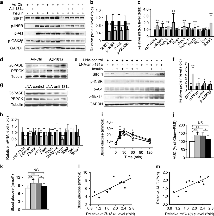 miR-181a regulates SIRT1 and hepatic insulin sensitivity in vivo. a, b Overexpression of miR-181a by adenovirus (Ad-181a) in mouse liver decreased SIRT1 levels and the insulin-stimulated phosphorylation of INSR, Akt and GSK3β. Eight-week-old male C57BL/6 mice were infected with the indicated adenovirus by tail vein injection, and were killed 12 days later to detect by immunoblotting the indicated proteins in liver stimulated with or without insulin. Black bars, control adenovirus (Ad-Ctrl); grey bars, Ad-181a. **p < 0.01 vs Ad-Ctrl, n = 9 for each group in (b). c miR-181a and the mRNA levels of the genes indicated were detected by real-time PCR in mouse liver infected with Ad-181a (grey bars) or Ad-Ctrl (black bars), as described in (a). *p < 0.05, **p < 0.01 vs Ad-Ctrl, n = 6–9 for each group. d The protein levels of G6Pase and phosphoenolpyruvate carboxykinase (PEPCK) were increased in mouse liver infected with Ad-181a when detected by immunoblotting. e, f Intraperitoneal injection of LNA-anti-181a increased SIRT1 protein levels and the insulin-stimulated phosphorylation of INSR, Akt, and GSK3β in the liver of DIO mice. The proteins indicated were measured by immunoblotting (e) and quantified by densitometry (f). Black bars, LNA-control; grey bars, LNA-anti-181a. *p < 0.05 vs LNA-control. g LNA-anti-181a decreased the protein levels of G6pase and PEPCK in the livers of DIO mice when measured by immunoblotting. h MiR-181a and mRNA levels of the genes indicated were detected in the livers of DIO mice injected with LNA-anti-181a (grey bars) or LNA-control (black bars). Real-time PCR was used to analyse these genes. *p < 0.05, **p < 0.01 vs LNA-control, n = 9–11 for each group. i, j LNA-anti-181a improved glucose tolerance in DIO mice as determined by a glucose tolerance test (GTT) (i). White diamonds, chow PBS; black circles, high-fat diet+PBS; white triangles, high-fat diet+LNA-control; black squares, high-fat diet+LNA-anti-181a. The area under the curve (AUC) of GTT was also reduced by LNA-anti-181a (j) White bars, chow+PBS; light grey bars, high-fat diet+PBS; dark grey bars, high-fat diet+LNA-control; black bars, high-fat diet+LNA-anti-181a. *p < 0.05, **p < 0.01 vs LNA-control, n = 9–13 for each group. k LNA-anti-181a decreased the 4-h fasting blood glucose levels in DIO mice. White bar, chow+PBS; light grey bar, high-fat diet+PBS; dark grey bar, high-fat diet+LNA-control; black bar, high-fat diet+NA-anti-181a. *p < 0.05, **p < 0.01 vs LNA-control, n = 9–13 for each group. l, m Individual correlation between hepatic miR-181a levels and 4-h fasting blood glucose levels (l; R 2 = 0.58, p = 0.006) or the AUC of GTT (m; R 2 = 0.63, p = 0.003) in the DIO mice injected with LNA-anti-181a (n = 11). Statistical significance was assessed by Pearson correlation coefficient test. Error bars represent SD