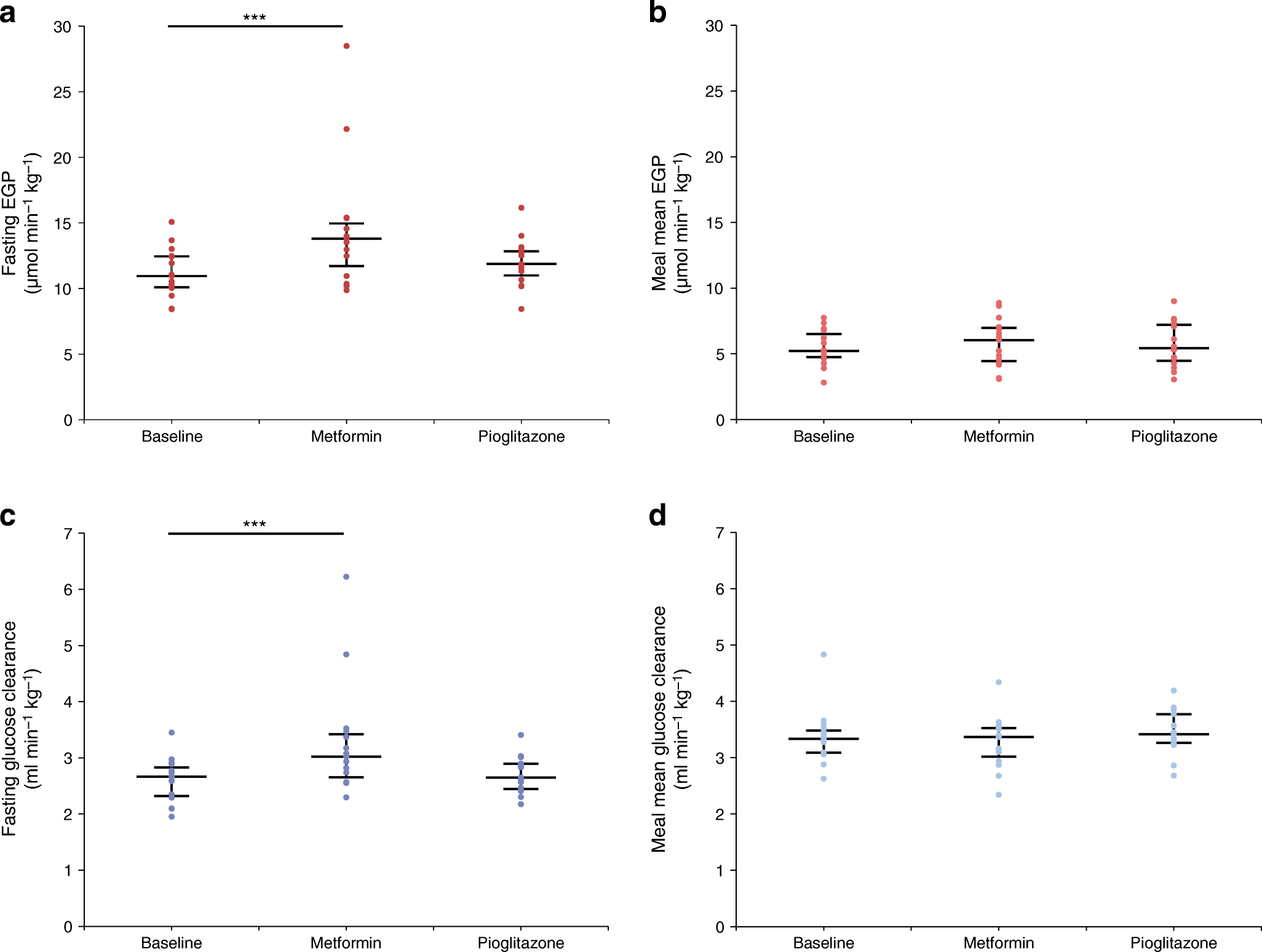 In this non-randomised, non-blinded, open-label crossover study we treated non-diabetic individuals with two commonly used diabetes drugs, namely, metformin and pioglitazone. The time in study was 17 weeks, consisting of two 8 week treatment periods separated by 1 week washout. During treatment period one, participants were treated with metformin, titrated to a maximum of 1000 mg twice daily. During treatment period two, participants were treated with pioglitazone, titrated to 30 mg once daily. Each participant had three study visits: baseline, post-metformin and post-pioglitazone. Each visit included a dual-tracer mixed-meal test (MMT), to assess glucose kinetics in the fasted and non-steady state.