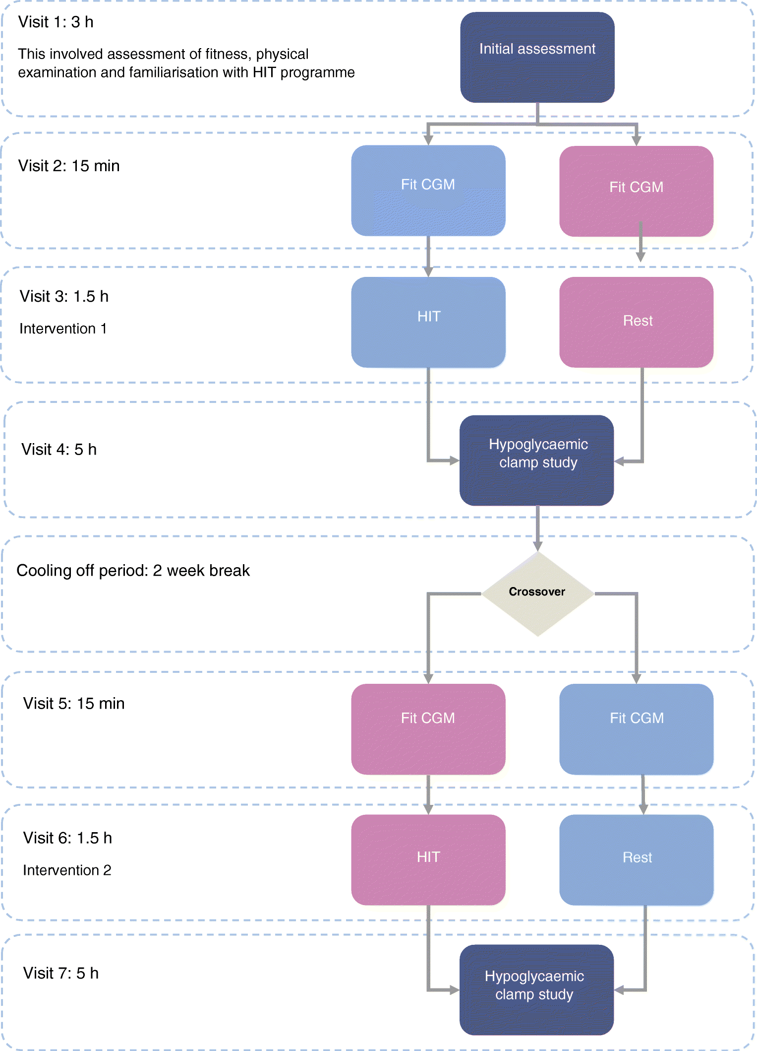 Prior to commencing the hypoglycaemic clamp, CGM data were analysed to ensure there was no hypoglycaemia in the preceding 24 h. If there was evidence of hypoglycaemia the study was postponed and the intervention visit repeated. The study was postponed and intervention repeated three times in total by two participants: one participant had to repeat both interventions and one had to repeat the rest intervention alone.