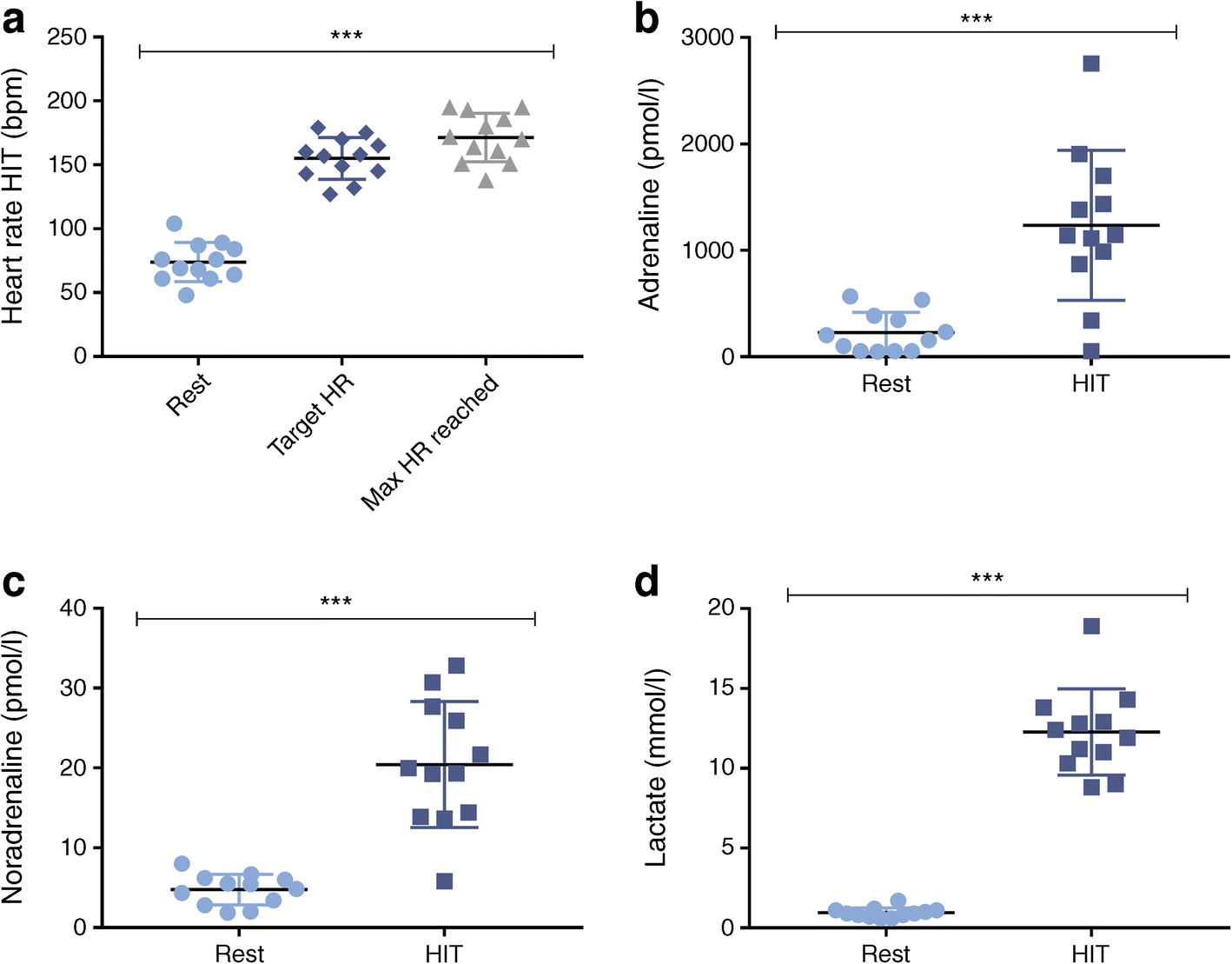 Physiological responses to HIT for each participant. (a) Heart rate during rest, at the 90% maximum heart rate target determined from the \( \dot{V}{\mathrm{O}}_{2\mathrm{peak}} \)test, and the maximum heart rate reached during HIT. (b, c, d) Adrenaline (b), noradrenaline (c) and lactate (d) during rest and HIT interventions. n = 12; values are the mean ± SEM. ***p< 0.001 by paired t test comparing rest with HIT or max HR reached. HR, heart rate; max, maximum