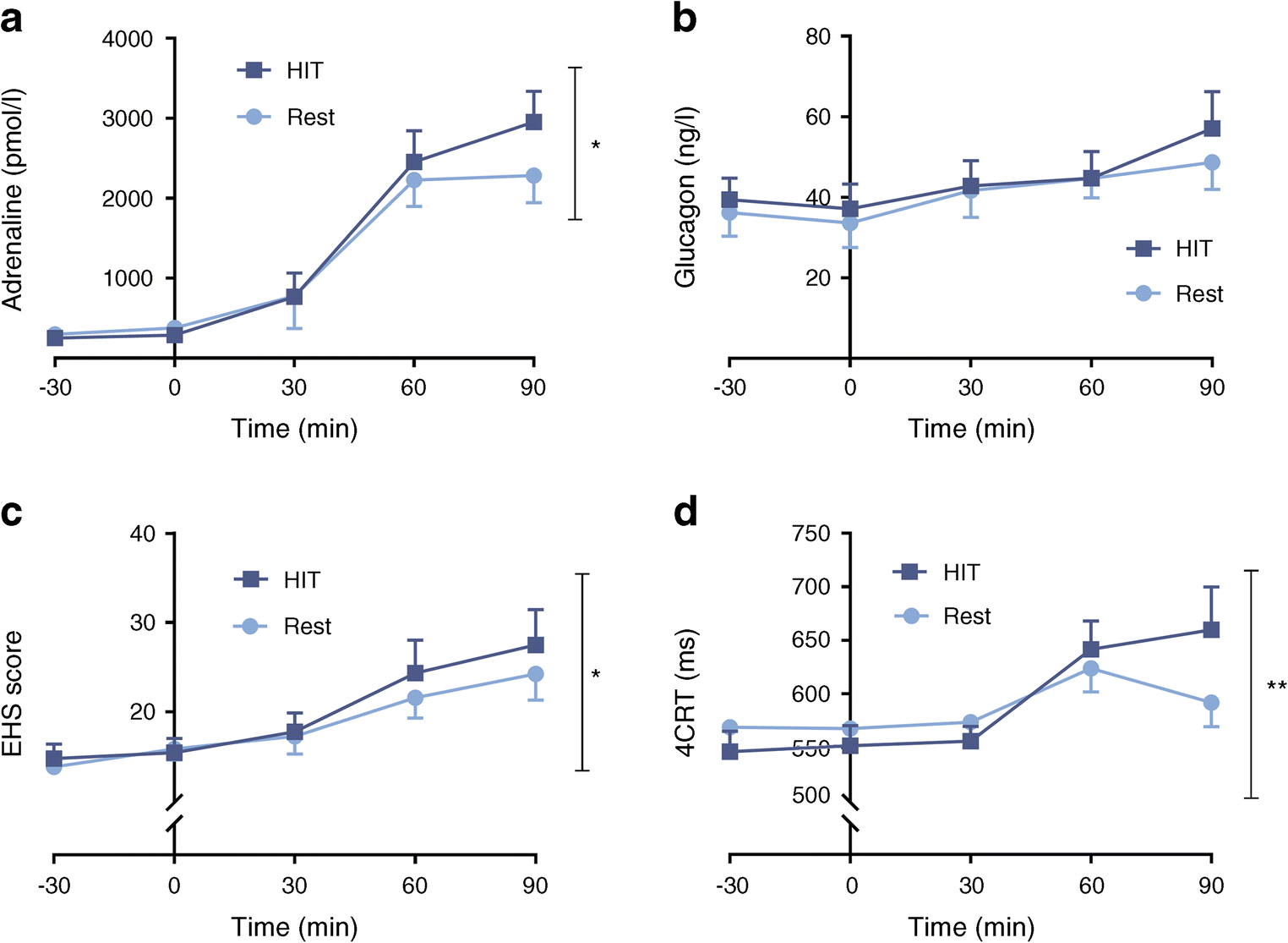 Acute exposure to HIT improves defective counterregulatory response. Plasma adrenaline (a), glucagon (b), total EHS score (c) and 4CRT (d) during the hyperinsulinaemic–hypoglycaemic clamp study. n = 12; values are the mean ± SEM. *p<0.05, **p<0.01 using the generalised estimate equation