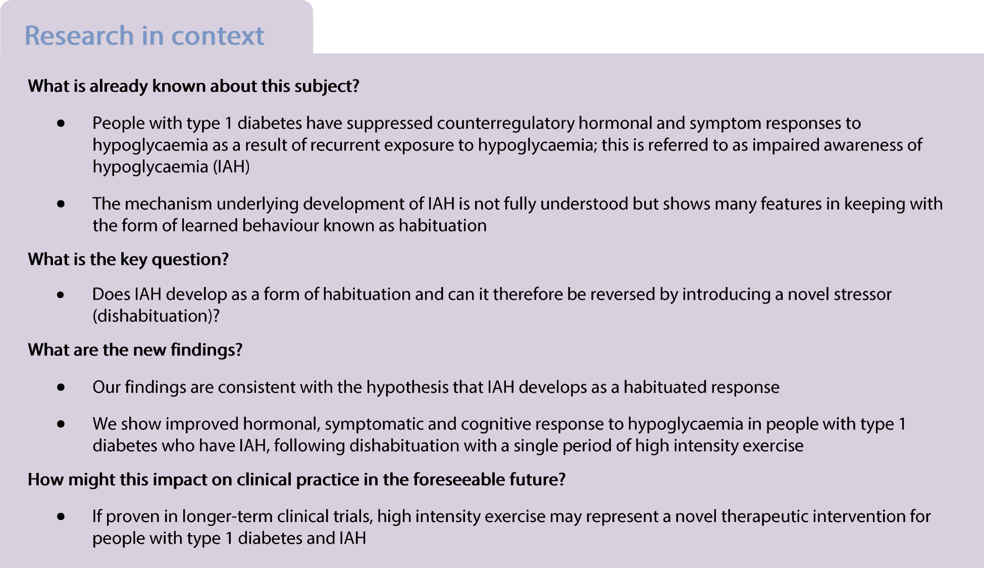 Overall, the current study supports the hypothesis that IAH in type 1 diabetes develops as a result of habituation. This is not firmly established as additional studies will need to be performed to test the other features of habituation. However, consistent with our hypothesis, we have demonstrated that the introduction of HIT as a dishabituating stimulus, in people with long-standing type 1 diabetes and IAH, acutely restores a broad array of physiological, symptomatic and cognitive responses during subsequent experimental hypoglycaemia. If this effect is maintained following a more prolonged intervention with HIT, it may offer a novel, therapeutically attractive strategy to improve and restore hypoglycaemia awareness in people with type 1 diabetes and reduce the risk of severe hypoglycaemia.
