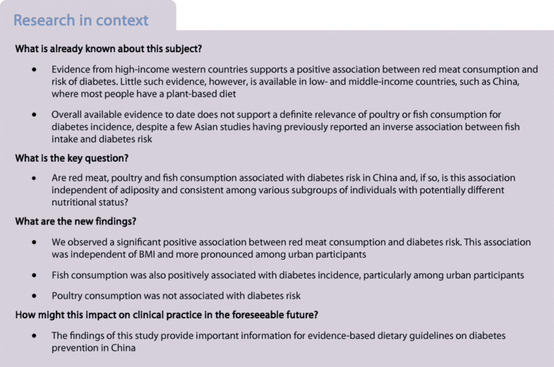 The study also has several limitations. First, we collected outcome information through linkage with hospitalisation records, so some non-hospitalised incidences of diabetes may have been missed. However, we have previously observed that diabetes prevalence based on the CKB re-survey population was reasonably consistent with nationally representative surveys [3]. On the other hand, such under-reporting in outcome measures would most likely be non-differential and thus not overestimate risk estimates. Second, our dietary questionnaire is relatively simple, collecting consumption data for only some of the major food groups instead of individual food items. Hence, it was not possible to adjust for total energy intake and other specific dietary factors (e.g. saturated fat, salt and dietary fibre). However, total energy intake should not play a major role in the observed associations because our main analyses were adjusted for both BMI and physical activity, which together could be considered as a good proxy for total energy intake. Third, we were unable to distinguish between unprocessed and processed red meat or between different types of red meat (i.e. pork, beef or lamb) and fish (e.g. fatty fish or lean fish). However, the nationally representative nutrition survey showed that unprocessed pork accounts for ~80% of total red meat consumption in China [44]. Fourth, the observed heterogeneities across BMI categories (for red meat) and across regions could not be properly explained. Last, as in all observational studies, the possibility of residual confounding cannot be ruled out and causality cannot be automatically assumed.