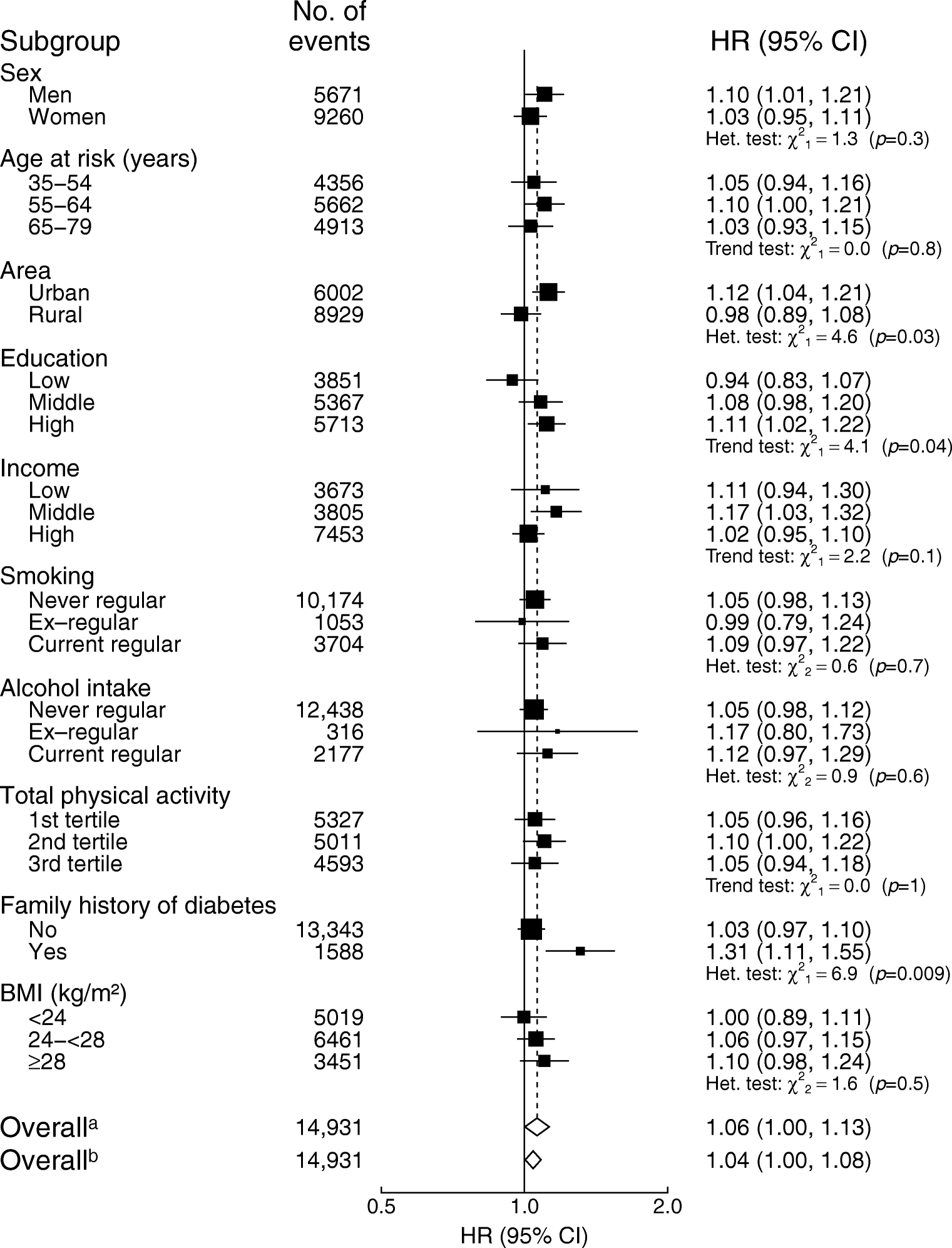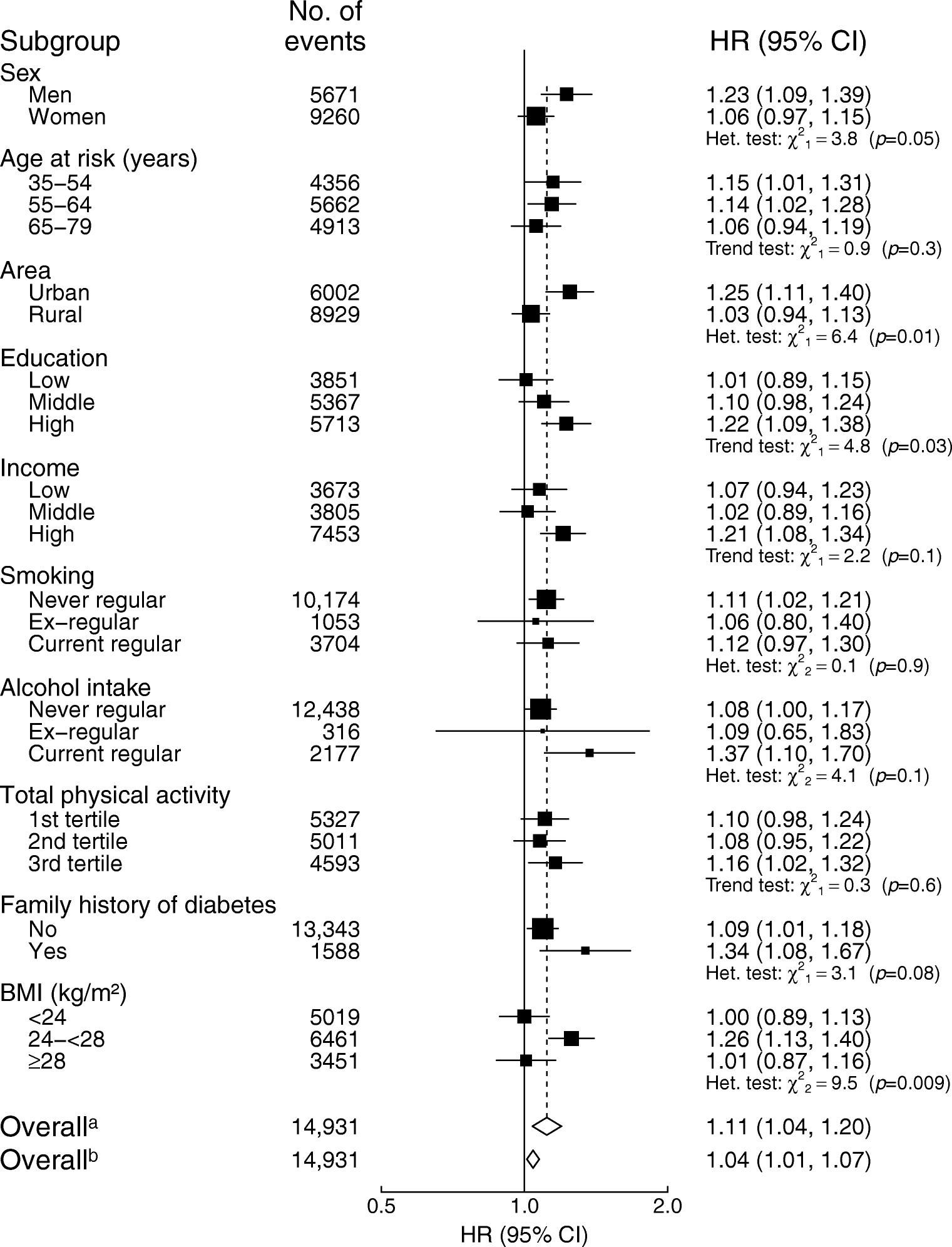 Adjusted HRs (95% CIs) for diabetes per 50 g/day of red meat intake by subgroups. Analyses were stratified by age-at-risk, sex and region, and adjusted for education, income, smoking, alcohol intake, physical activity, consumption of fresh fruit, fish and poultry, family history of diabetes, and BMI. Black squares, HRs (size is inversely proportional to the variance of the loge HR); horizontal lines, 95% CIs; white diamonds, overall HRs. aOverall HR per 50 g/day usual red meat intake after correcting for regression dilution bias. bOverall HR per 50 g/day baseline red meat intake before correcting for regression dilution bias. ‘No. of events’ refers to the number of incident diabetes cases in each group. The subscript numbers in the χ2 values represent the degrees of freedom
